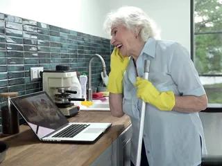 Andrea hört auf zu putzen und fingert sich lieber auf der Küchenzeile